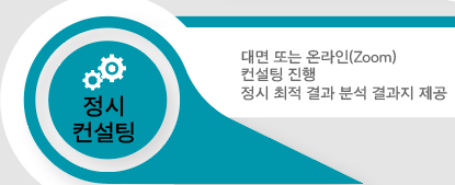 정시 컨설팅 세부 프로그램 안내 1. 대면 또는 온라인(Zoom) 정시 배치 상담 - 사전 예약을 통해 학생 생활기록부, 수능 성적표를 이메일로 전달 - 사전 이메일로 전달된 학생 생활기록부와 수능 성적표를 종합 분석하여 합격전략 로드맵 수립 - 수능 성적에 맞추어 군별 상향, 적정, 안정 등 가, 나, 다군별로 각각 학교와 ...